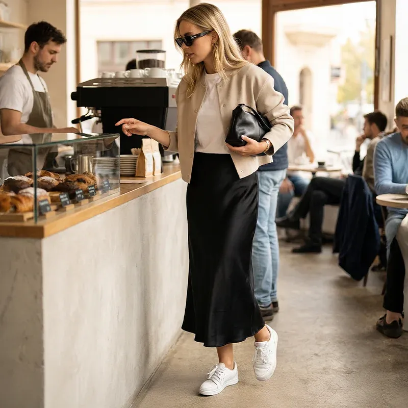 The satin skirt feels so soft and comfy! The shine makes it look super fancy, and I love how it twirls when I walk.